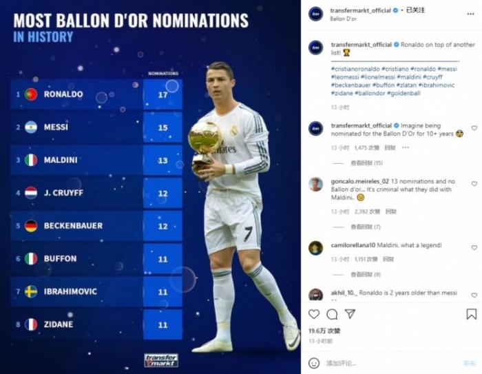 24直播网10月31日讯 金球奖不久后就要揭晓,今日,德转盘点了足球史上金球奖提名次数最多的球员,其中C罗17次位居第一,梅西第二。