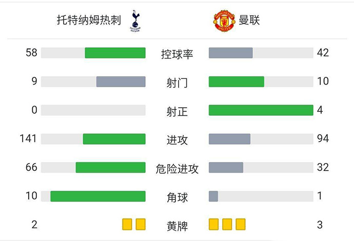 第82分钟,凯恩禁区内打门被马奎尔挡出。第85分钟,马蒂奇送出直塞,拉什福德单刀球轻松推射远角破门,热刺0-3曼联!