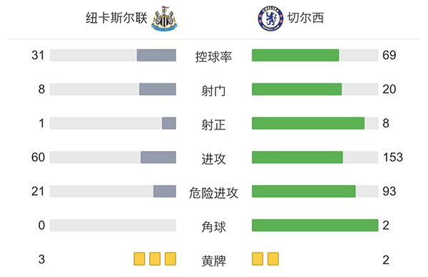 全场比赛结束,切尔西3-0战胜纽卡斯尔,收获联赛4连胜。