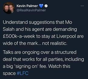 该记者表示,萨拉赫和他的经纪人要求50万英镑周薪续约是不现实的。