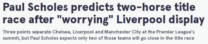 24直播网10月27日讯 据英国媒体《镜报》报道,曼联名宿斯科尔斯在曼联0-5惨败利物浦的赛后表示,本赛季的英超冠军会在曼城和利物浦之间产生。