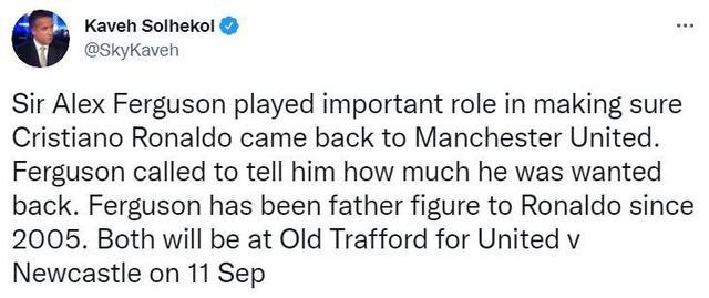 24直播网8月28日讯 据天空体育记者Kaveh Solhekol报道,弗格森在C罗回归曼联这笔交易中起了很大作用。
