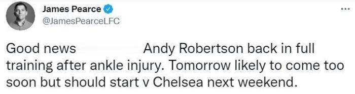 利物浦的好消息,罗伯逊已经恢复了球队的合练,但是明天就上场对他来说还太早,下周末对阵切尔西的比赛他应该就可以复出。