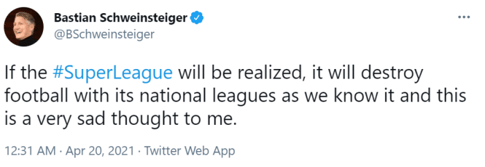 24直播网4月20日讯 前拜仁、曼联中场施魏因斯泰格今日在推特上发文反对欧洲超级联赛,他表示欧超联赛会毁掉足球。
