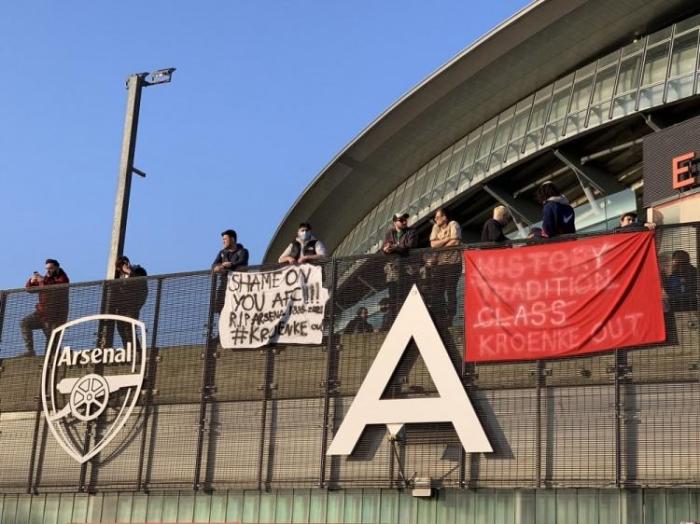 阿森纳的球迷们今天来到了酋长球场外,他们拉起写着“阿森纳,我们为你感到羞耻”、“无视历史、传统、风范,克伦克OUT”、“去你x的欧洲超级联赛”字样的横幅,表示抗议。