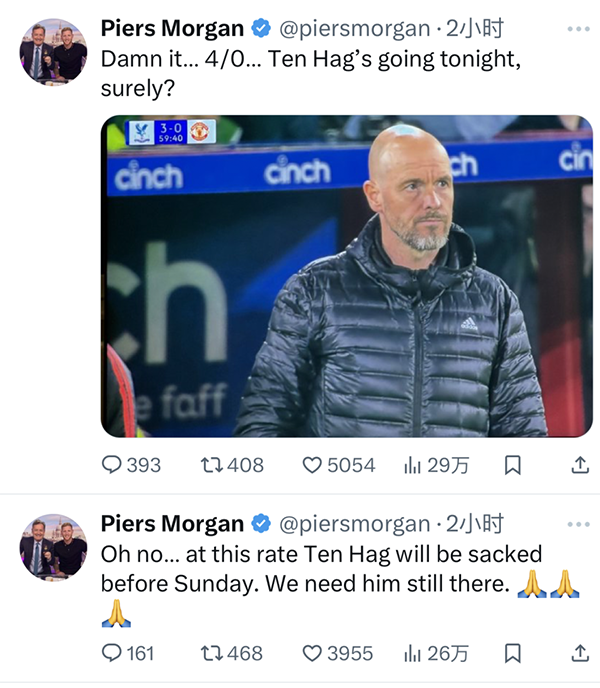 摩根首先写道:“曼联球员们别这样啊!这样下去滕哈格周末踢阿森纳之前,就要被解雇了,我们阿森纳需要他。”在水晶宫攻入第4球时,摩根晒出滕哈格在场边表情茫然的窘态,并写道:“4-0了,滕哈格今晚就要走了,是不是?”