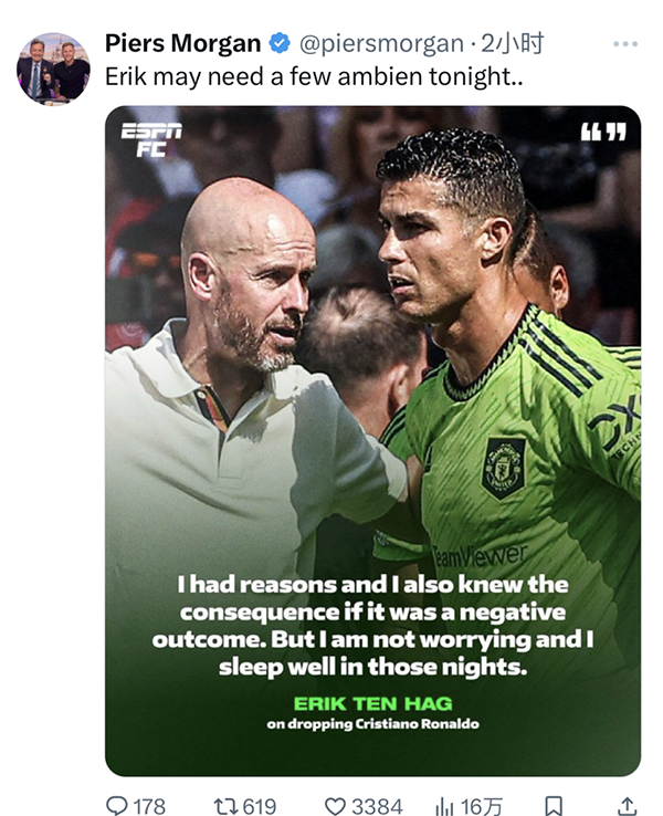 此前谈到和C罗的矛盾时,滕哈赫曾表示自己并不担忧,晚上睡得很好。摩根适时再次翻出这一采访,并嘲讽道:“真是这样吗?没有C罗的滕哈格,今晚可能需要吃安眠药了!”