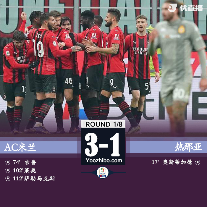 北京时间1月14日凌晨4:00,意大利杯1/8决赛,AC米兰迎来热那亚的挑战。上半场波塔诺瓦利用角球机会助攻奥斯蒂加德破门,托莫里伤退,热那亚1-0暂时领先米兰;下半场吉鲁为米兰扳平比分,常规时间两队1-1战平;加时赛莱奥和萨勒马科尔斯建功,最终米兰加时3-1热那亚晋级八强。