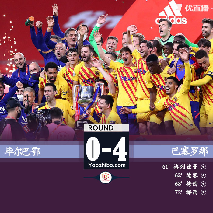 北京时间4月18日03:30,2020-2021西班牙国王杯决赛,巴塞罗那对阵毕尔巴鄂竞技。上半场巴萨获得绝对控球优势,德容推射中柱。下半场格列兹曼、德容短时间内连进两球,梅西随后梅开二度。最终,巴萨4-0毕尔巴鄂竞技夺冠。