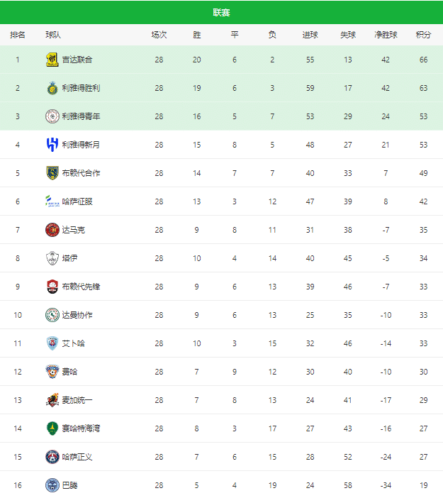 24直播网05月24日沙特联赛第28轮结束争夺,吉达联合1-0小胜巴腾,无限逼近联赛冠军。C罗率领利雅得胜利面对利雅得青年,上演让二追三的好戏,3-2掀翻对手,依旧有夺冠的希望。保级的争夺还是很激烈的,接下来我们一起来看看沙特联赛最新排名: