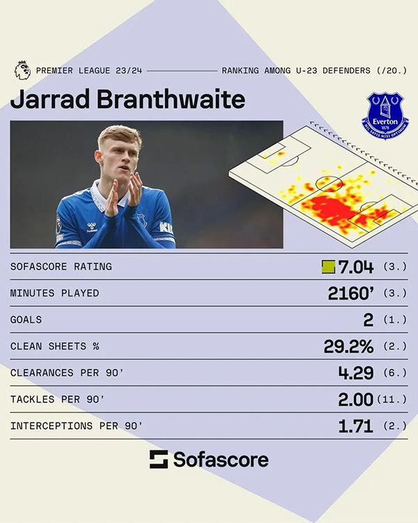 24直播网03月12日讯曼联新老板吉姆·拉特克里夫爵士被曝已经确定另一名夏窗引援目标,埃弗顿中卫贾拉德·布兰斯韦特(Jarrad Branthwaite)已被确定为俱乐部今夏改造防线时的首选。