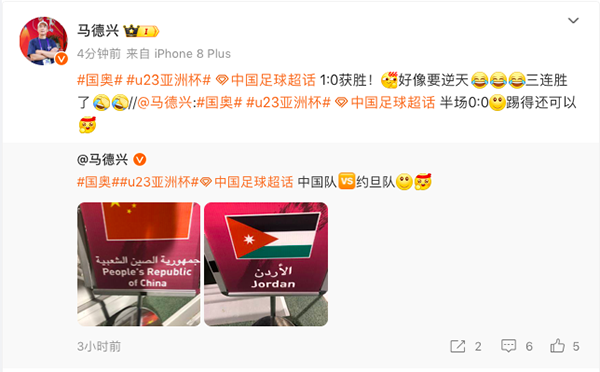 24直播网讯 在北京时间4月8日凌晨结束的一场国奥热身赛中,中国国奥1-0力挫约旦国奥队。上半场,双方互交白卷。易边再战,中国国奥终于取得进球,并且将1球优势保持到终场。此役获胜后,国奥喜获热身赛3连胜,名记马德兴都忍不住称赞,国奥近期的表现“逆天了”。