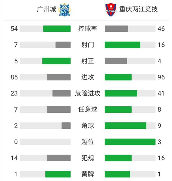 全场比赛结束,广州城3-1战胜重庆两江竞技。