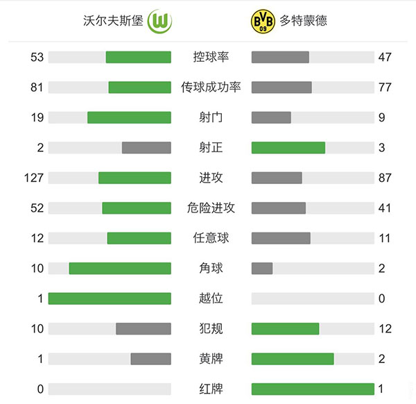 全场比赛结束,最终多特客场2-0击败沃尔夫斯堡。
