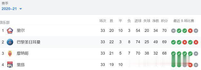 目前,法甲已经进行了33轮联赛,里尔70分排名第一,巴黎69分排名第二,摩纳哥68分排名第三,里昂67分排名第四,前四球队互相之间只差1分。