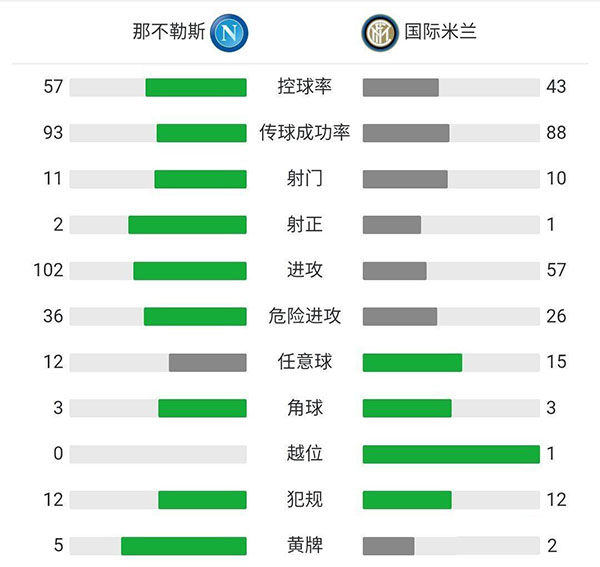 全场比赛结束,国际米兰客场1-1战平那不勒斯。