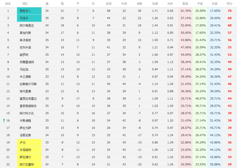 如此大幅度的丢分,其他球队也有机会超越马略卡竞争直接冲甲名额,但是阿尔梅里亚、莱加内斯也都在近期遭遇滑铁卢,输多胜少,使得马略卡得以继续稳居积分榜前二名。希洪竞技的崩盘则是非常快速的,最近3轮遭遇萨三连败,直接错过了追赶直接冲甲区球队的绝佳机会,目前积分榜只有56分,该队的主帅是西班牙人旧帅加耶戈,而且拥有了西乙第一射手久尔杰维奇,未能取得上佳战绩实属可惜。
