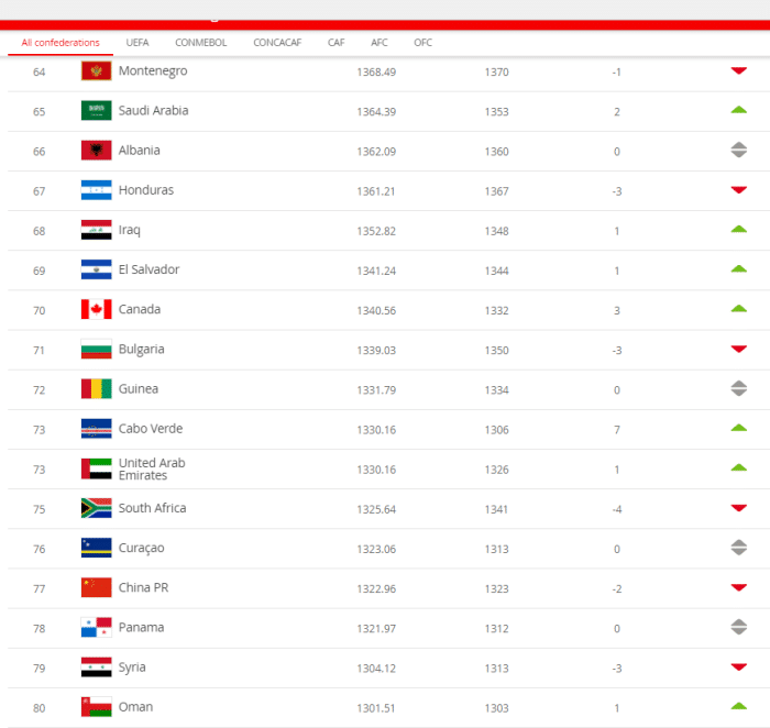 看完中国女足的排名之后,或许有球迷会问了,中国男足的排名是多少?小编去FIFA官网看了一下,中国男足的排名和上一期比,下降了两位,排名世界第77名,看来男足还要继续努力啊,毕竟这个排名确实有点低,还要继续努力才行。而且,中国男足在亚洲区的排名都不高,才排名亚洲第九名,这会影响国足世预赛和亚洲杯种子球队的身份。