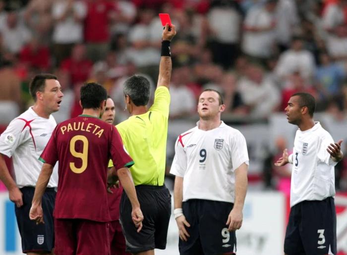 2006年德国世界杯上,英格兰在盖尔森基兴对决葡萄牙,鲁尼对进入四强充满信心,但他被红牌罚下,比赛拖至点球大战,葡萄牙取胜,C罗攻入关键点球。