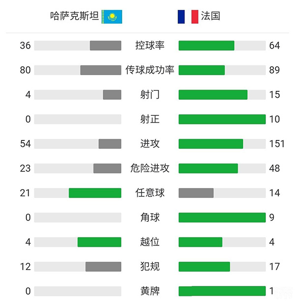 全场比赛结束,法国2-0完胜哈萨克斯坦,取得本届世预赛的首场胜利。