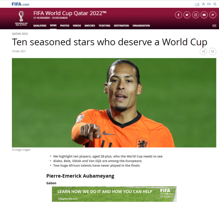 24直播网3月24日讯2022年世界杯越来越近,而国际足联也不停的为世界杯造势,近日,FIFA就在官网上发布了应该参加,也值得参加世界杯的10名球星,其中范迪克等诸多球星全部在列,而且里面还有一个令人意外的名字,那就是武磊,FIFA认为他也值得参加世界杯的比赛,而且FIFA官网还点评了武磊的表现。好了,话不多说,一起看看FIFA评选的球员有哪些,而他们对武磊的点评又如何吧!