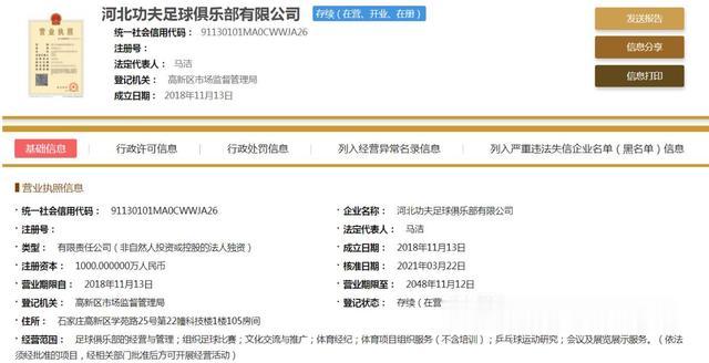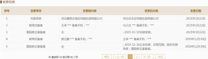 24直播网3月23日讯根据国家企业信息查询系统显示,河北精英足球俱乐部更名为河北功夫足球俱乐部。