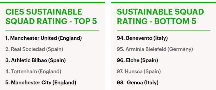 但这份榜单再往下看,红魔拥趸的心可能凉了半截,因为排名第二和第三的是西甲的皇家社会和毕尔巴鄂。而英超对手热刺曼城,则位列第4和第5位。