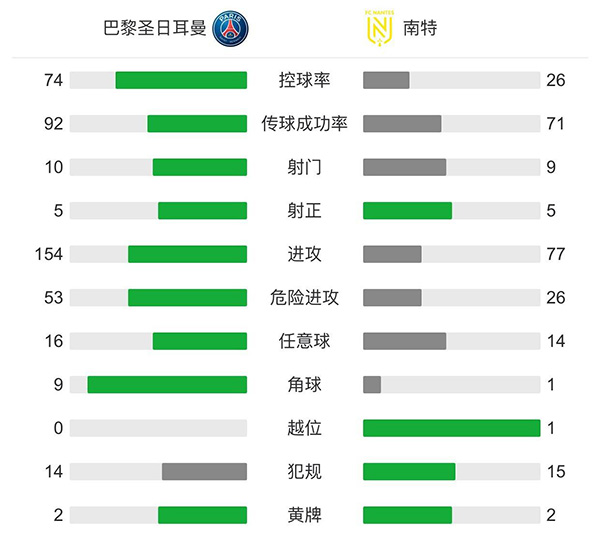 最终全场比赛结束,巴黎主场爆冷1-2遭南特逆转。