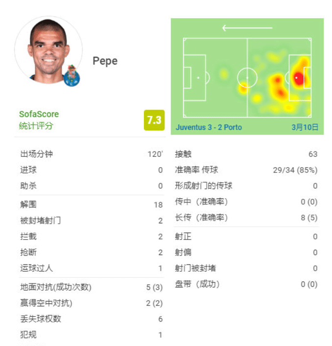 先看本场比赛的数据,佩佩本场比赛出场了120分钟,他贡献了18次解围,这是全场最高的数据,而且尤文全队的解围不过8次,佩佩一个人的数据就超过了尤文全队。同时佩佩5次对抗3次成功,2次争顶头球全部成功。此外还有2次拦截,2次抢断,8次长传5次到位。可以说佩佩是本场比赛表现最好的球员,正是因为他在防守端出色的表现,球队才最终淘汰尤文晋级。
