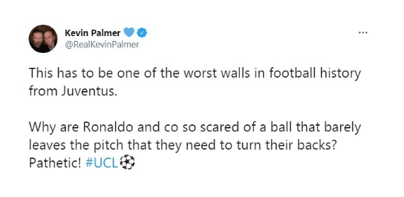 知名记者Kevin Palmer点评了尤文图斯的人墙,他直接对准了C罗,他被穿裆而且还躲了:“这肯定是尤文队史最差的人墙之一。这球几乎贴地,C罗和尤文球员们为什么要怕到背过身去?可悲!”