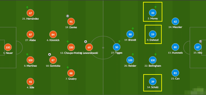 拜仁方面虽说也有5人伤停,但除了帕瓦尔以外其余影响不算太大,从阵容上多特蒙德就没有多少胜算。主教练泰尔齐奇排出了3421阵型,其中左路舒尔茨与小阿扎尔搭档去针对拜仁防守较为薄弱的右翼,已经算是不错的部署了,球队的第二球正是来自如此的部署。