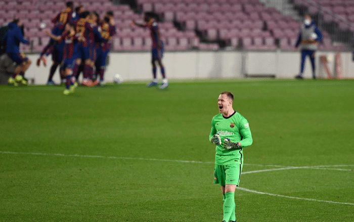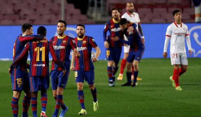 24直播网3月4日讯 国王杯半决赛次回合巴萨上演神奇逆转,他们在主场通过加时赛以3-0击败塞维利亚,总分3-2逆转对手,挺进到了本赛季国王杯决赛。这场比赛巴萨赢得非常惊险,登贝莱早早取得进球,但塞维利亚获得点球,好在特尔施特根神奇扑点成功,如果点球打进的话,巴萨需要再进3球才行。接下来神剧情出现,常规时间内第93分08秒,皮克进球扳平比分,比赛进入到加时赛。加时赛布莱斯维特头球为巴萨反超,巴萨顶住压力,成功晋级到国王杯决赛。
