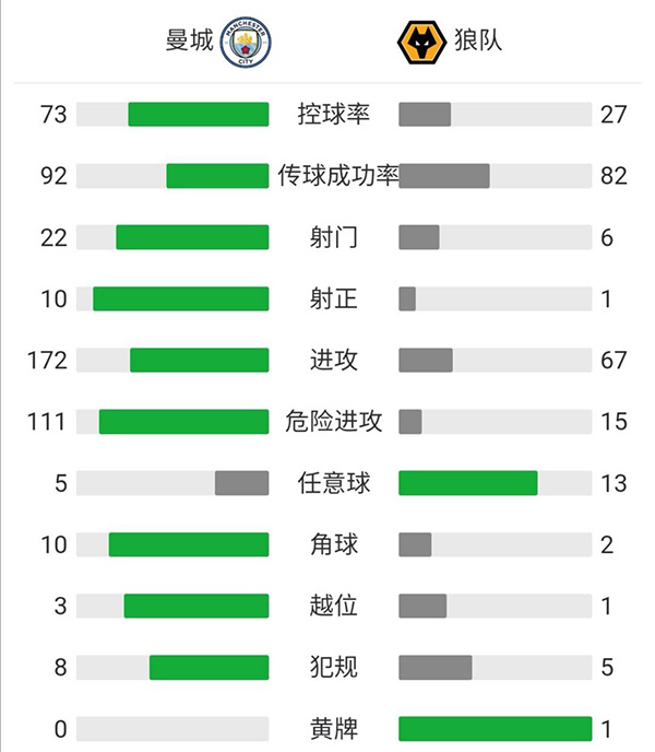最终全场比赛结束,曼城4-1击败狼队。