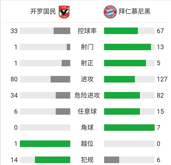 全场比赛结束,拜仁慕尼黑2-0击败阿尔艾利开罗,晋级世俱杯决赛。