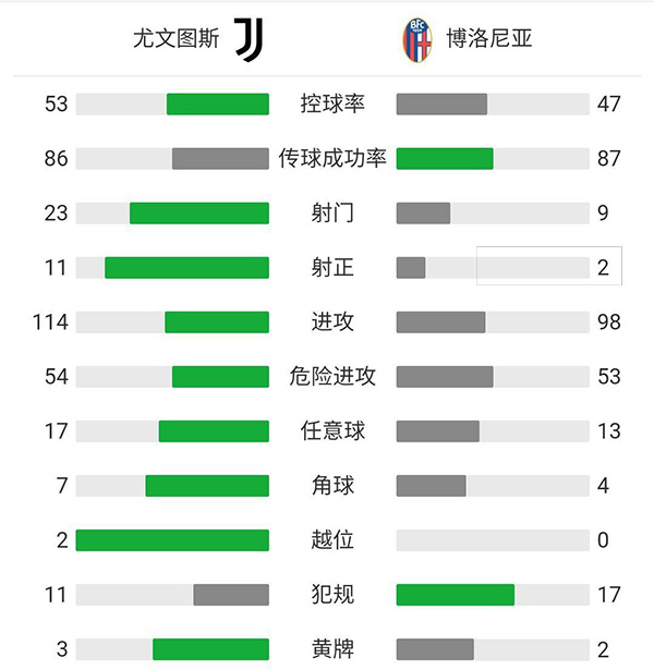 查看:尤文图斯vs博洛尼亚 全场录像技术统计: