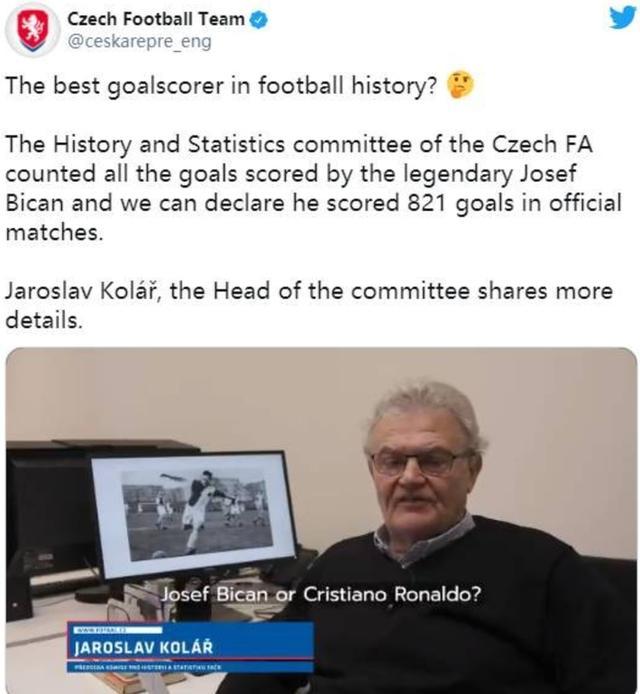 24直播网1月22日讯 捷克足协最近在他们的官方推特上发文表示约瑟夫-比坎的正式比赛进球数为821个,这意味着C罗还差62球才能超过这位捷克传奇球星,成为历史上正式比赛进球最多的球员。
