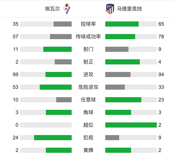 最终,比赛结束埃瓦尔1-2马德里竞技。