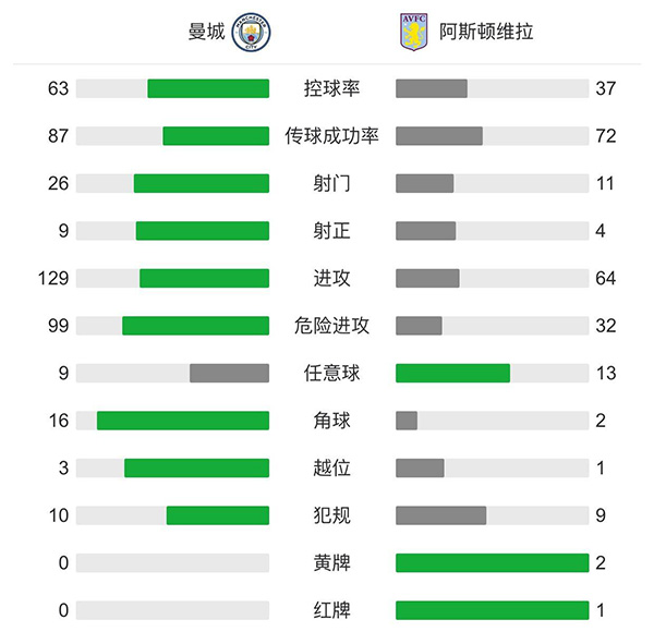 全场比赛结束,曼城2-0击败维拉,取得六连胜,登顶积分榜。