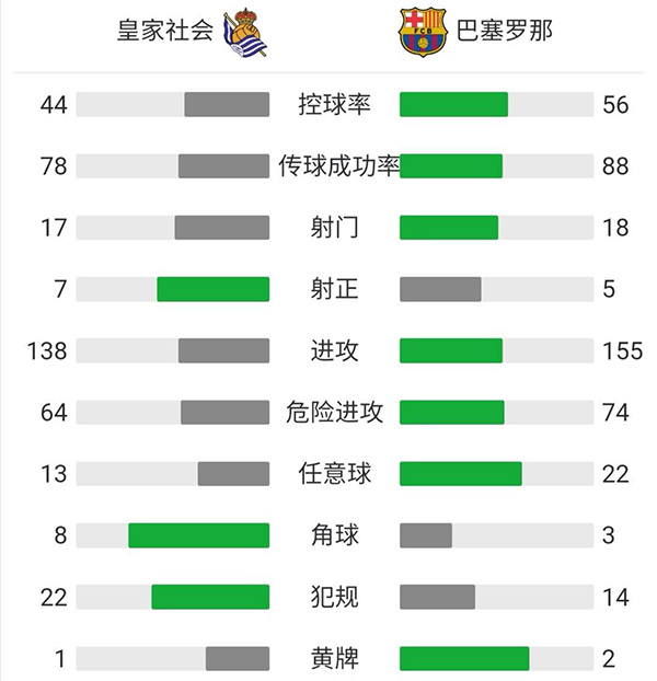 查看:皇家社会vs巴塞罗那 全场录像技术统计: