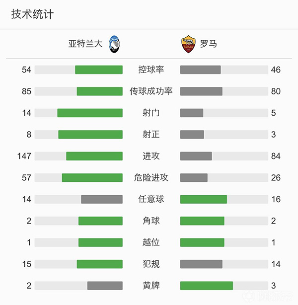 第58分钟,亚特兰大扳平比分!伊利西奇禁区前沿得球直塞,萨帕塔禁区得球转身爆射击中横梁下沿弹入球门,亚特兰大1-1罗马。