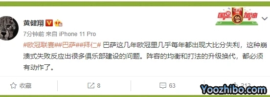 黄健翔赛后也发微博表示: 巴萨这几年欧冠里几乎每年都出现大比分失利,这种崩溃式失败反应出很多俱乐部建设的问题。阵容的均衡和打法的升级换代,都必须有动作了。