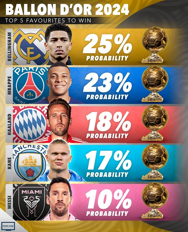 至于哈兰德,由于曼城欧冠被淘汰,再加上挪威无缘参加欧洲杯正赛。而且哈兰德本赛季在多场强强对话表现低迷,哈兰德获得本年度金球奖的概率已经跌至第4位。