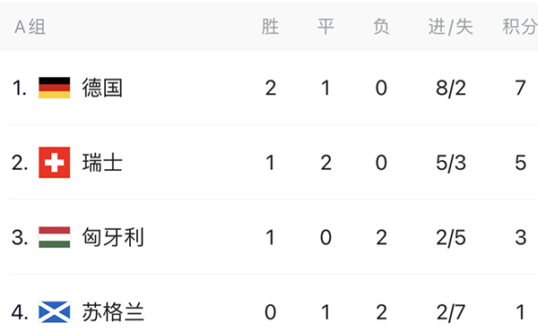A组3轮战罢,德国队2胜1平(5-1大胜苏格兰、2-0击败匈牙利、1-1绝平瑞士)积7分位列小组头名,瑞士1胜2平(3-1击败匈牙利、1-1绝平德国、1-1战平苏格兰)3轮不败积5分,获得小组第2名,两队携手出线。
