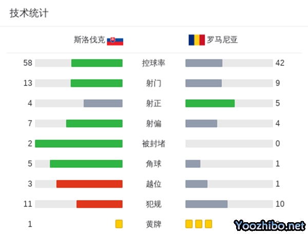 全场比赛结束,斯洛伐克1-1罗马尼亚。
