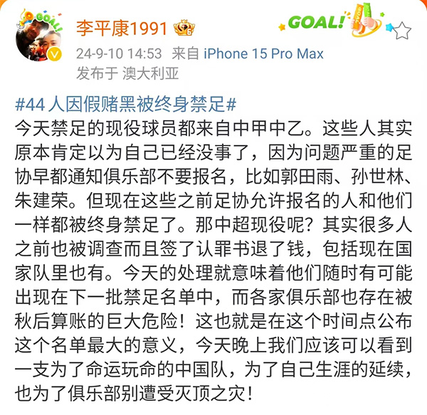 24直播网讯 9月10日,在中国国足对阵沙特的世预赛18强赛前,中国足协公布了上一次风暴中的禁足名单,在这一次名单中金敬道等43人被处于了终生禁足的名单,而且让人意外的是在被禁足5年的名单中,球迷看到了5月份接受采访的时候还表示自己不会拿别人钱,因为这不符合自己价值观的汪嵩。