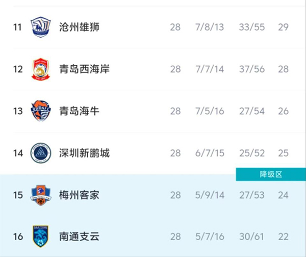 而第11名的沧州雄狮保级希望也很大,目前他们领先降级区5分,在剩余两轮比赛拿到1分即可保级成功。第12位的青岛西海岸同理,领先梅州客家4个积分,也是处于相对安全的位置。