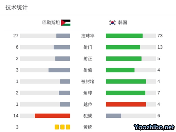 第12分钟,金玟哉回传门将被断,达巴格插上铲射被赵贤祐出击封堵,不过随后自己补射破门!韩国0-1巴勒斯坦!
