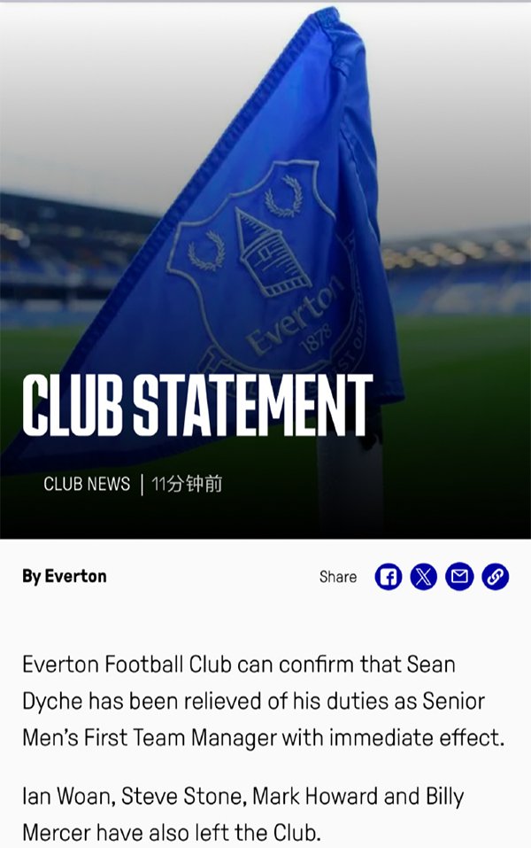 24直播网讯北京时间1月10日凌晨,英超劲旅埃弗顿俱乐部官方宣布,球队53岁的主教练肖恩-戴奇下课。戴奇也成为继滕哈格(曼联)、史蒂夫-库珀(莱斯特城前主帅)、拉塞尔-马丁 (南安普顿)、奥尼尔(狼队)、洛佩特吉(西汉姆联)之后,本赛季英超第6位中途下课的主教练。