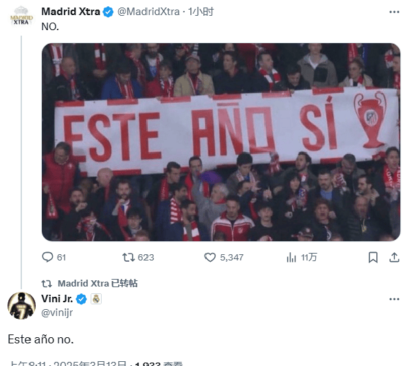 不仅如此,在皇家马德里喉舌Madrid Xtra发帖,晒出了一张马德里竞技球迷制作的TIFO,指代的是马竞今年拿欧冠,并说不是(今年)。维尼修斯随后还第一时间转发并且亲自回复:“Este año no.(确实不是今年)!”