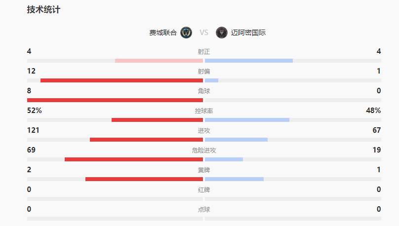 关键事件: 第3分钟,迈阿密先下一城!约瑟夫-马丁内斯右路接克里夫索夫长传球杀入禁区小角度抽射得手,费城联合0-1迈阿密国际。